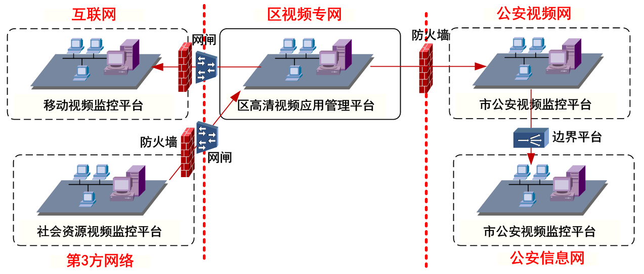 在区委监控中心,区视频专网通过视频安全网关接入区电子政务外网,通过政务外网,区各职能主管部门(城管、环保、交管、市政、消防等)和街道(或片区)办事处各职能科室、社区工作站调用,能够对所发生的情况进行实时监控和及时处理要求。